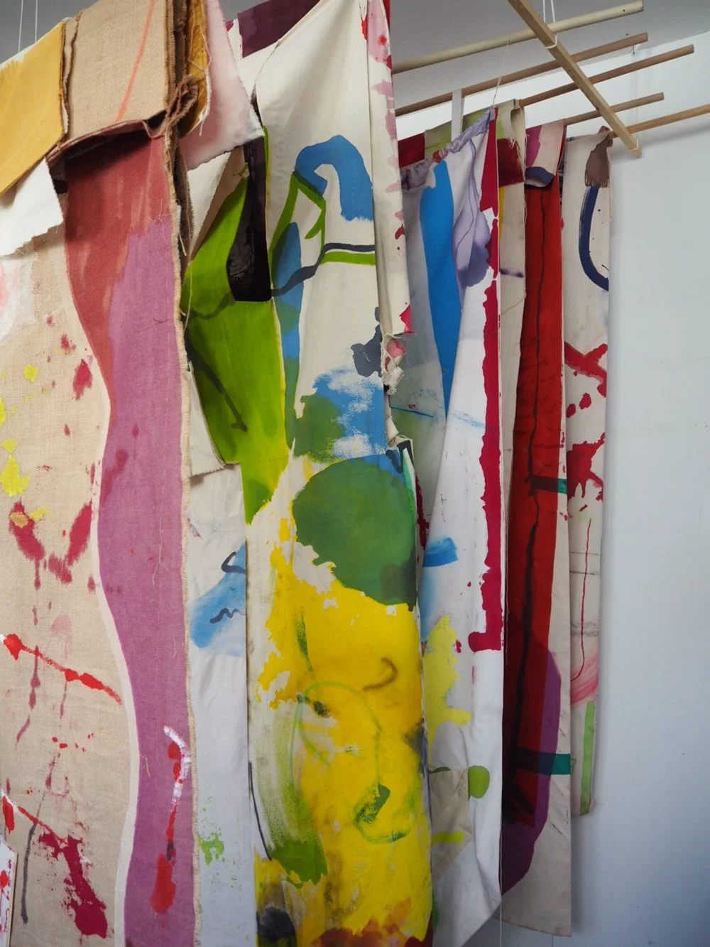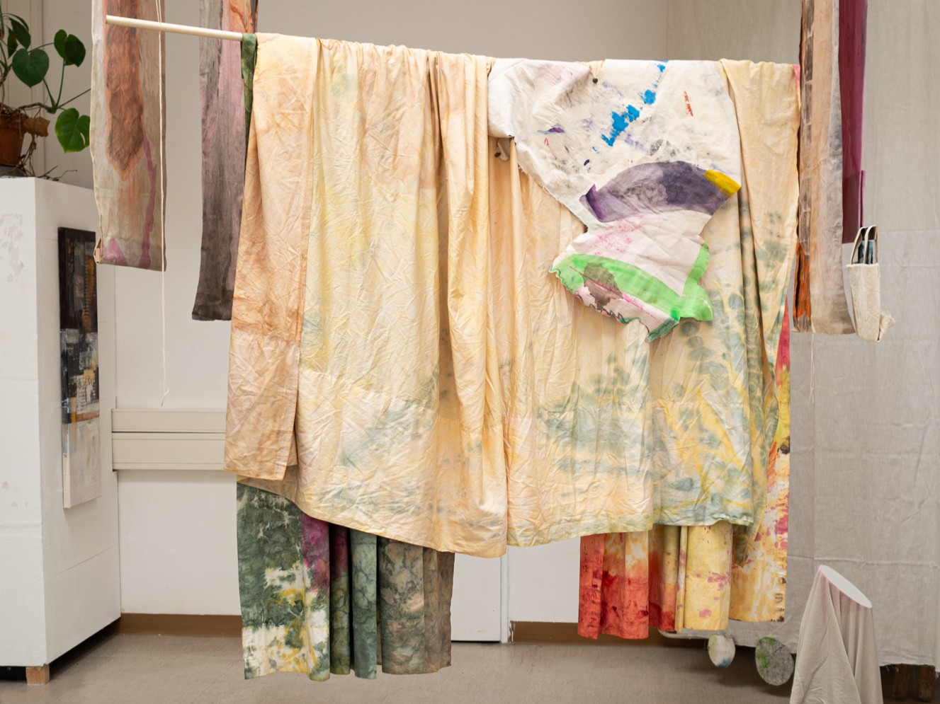 The “Painting Buddies” series revolves around the textile pictorial body, its development as painting and as a mobile form, which finds new positions and contexts depending on the exhibition situation. The works are inspired by everyday objects such as items of clothing and curtains, partly through the choice of support material and partly through the way in which they are hung. In visual terms, the series is characterised by painting that seeks its result in trial and experiment, and in the possibilities of taking this process further into the space.